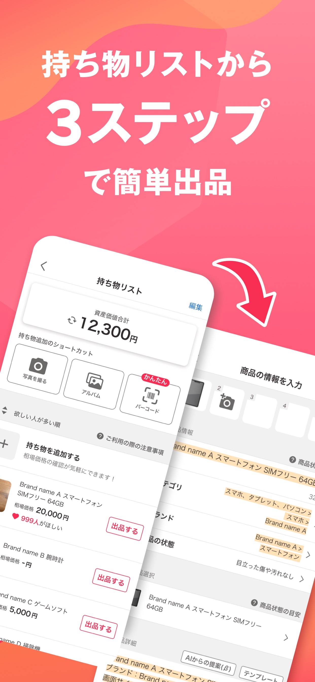 機能デモの役割を担うページ。「PayPay」のヘッドラインで上部テキスト+デバイスモックのレイアウトを使用。サブテキスト「がたまる・使えるフリマアプリ」で補足説明を追加。